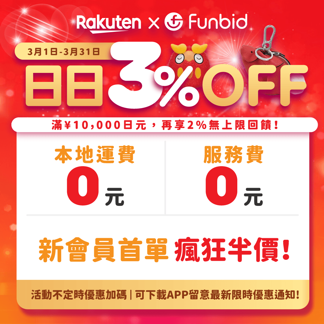 - 會員於1/3購買日本樂天商品金額¥10,000日元,可享3%折扣優惠 及 加碼回贈2%Fun Dollar優惠。