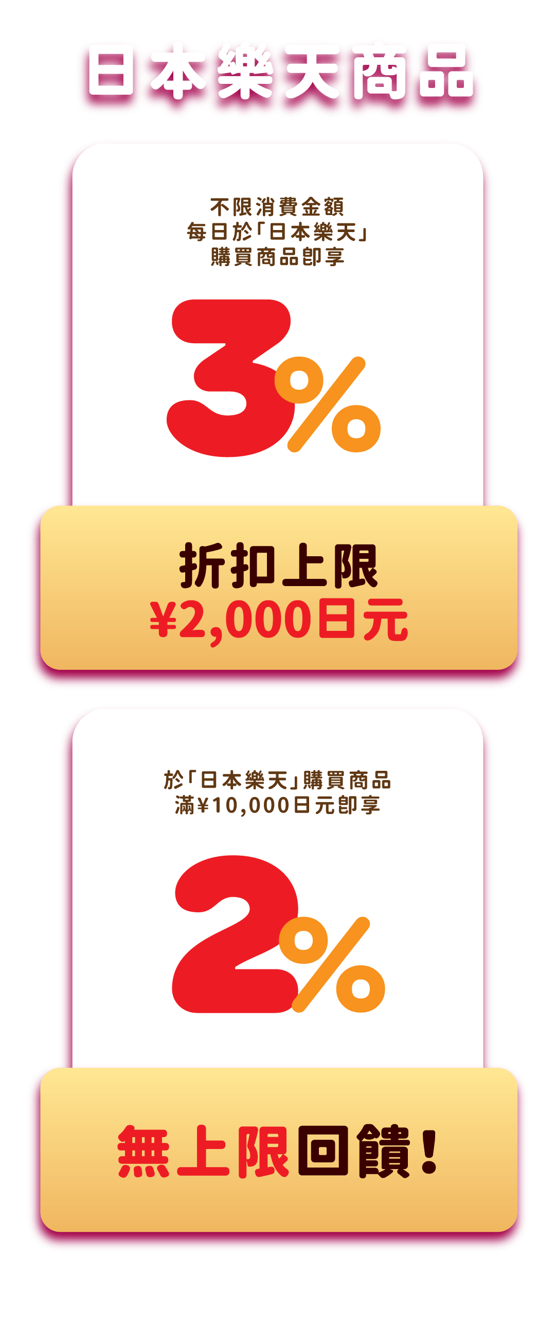 活動期間內,於「日本樂天」購買商品金額滿¥10,000日元,該筆訂單加碼再享商品金額2%回贈優惠,回贈金額無上限。