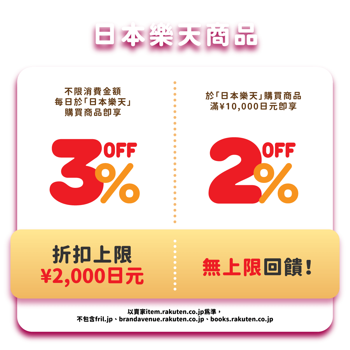活動期間內,於「日本樂天」購買商品,不限商品金額,即享商品金額3%折扣優惠,折扣上限¥2,000日元。