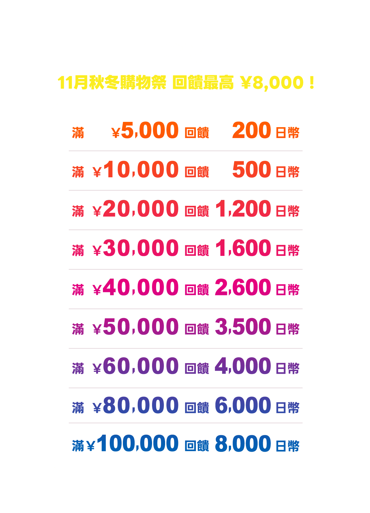 滿¥5,000,回饋200日幣滿¥10,000,回饋500日幣滿¥20,000,回饋1,200日幣滿¥30,000,回饋1,600日幣滿¥40,000,回饋2,600日幣滿¥50,000,回饋3,500日幣滿¥60,000,回饋4,000日幣滿¥80,000,回饋4,000日幣滿¥100,000,回饋8,000日幣(每筆委託單最高贈送¥8,000日幣回饋金)(商品折扣不列入計算)