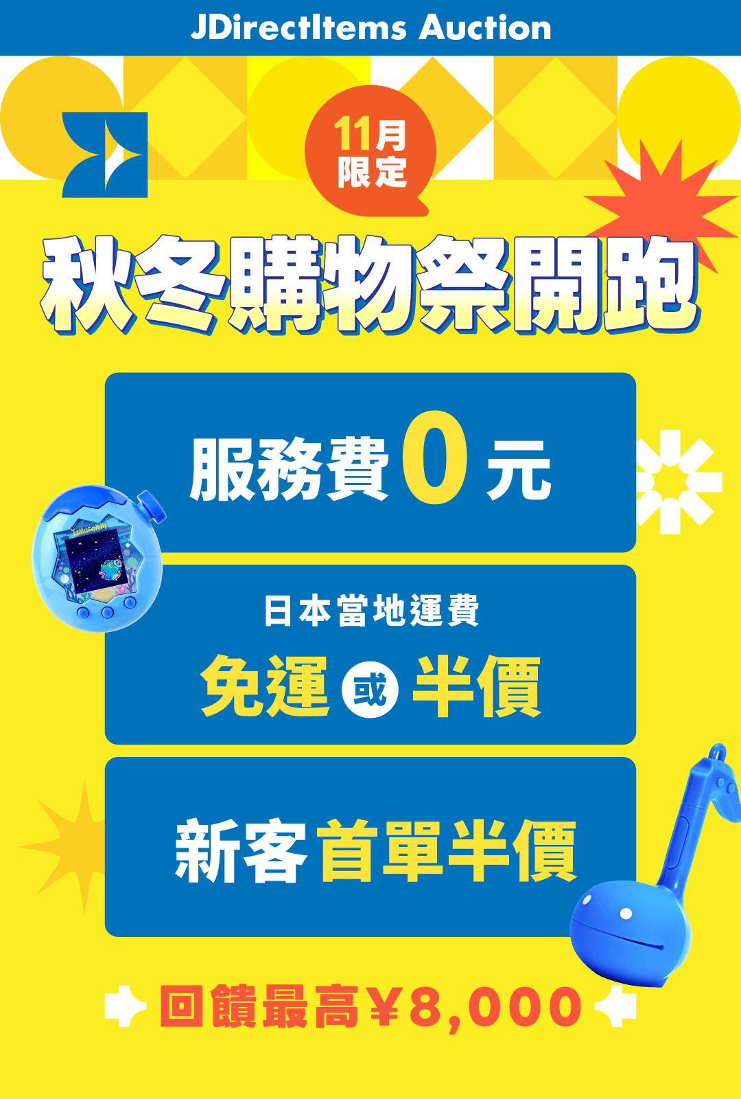 - 於「JDirectItems Auction」類別為「門票、優惠券、預約住宿」項目下之得標商品,及須轉寄至日本其他地址之委託單(日本寄日本) ,皆無法參加該活動。