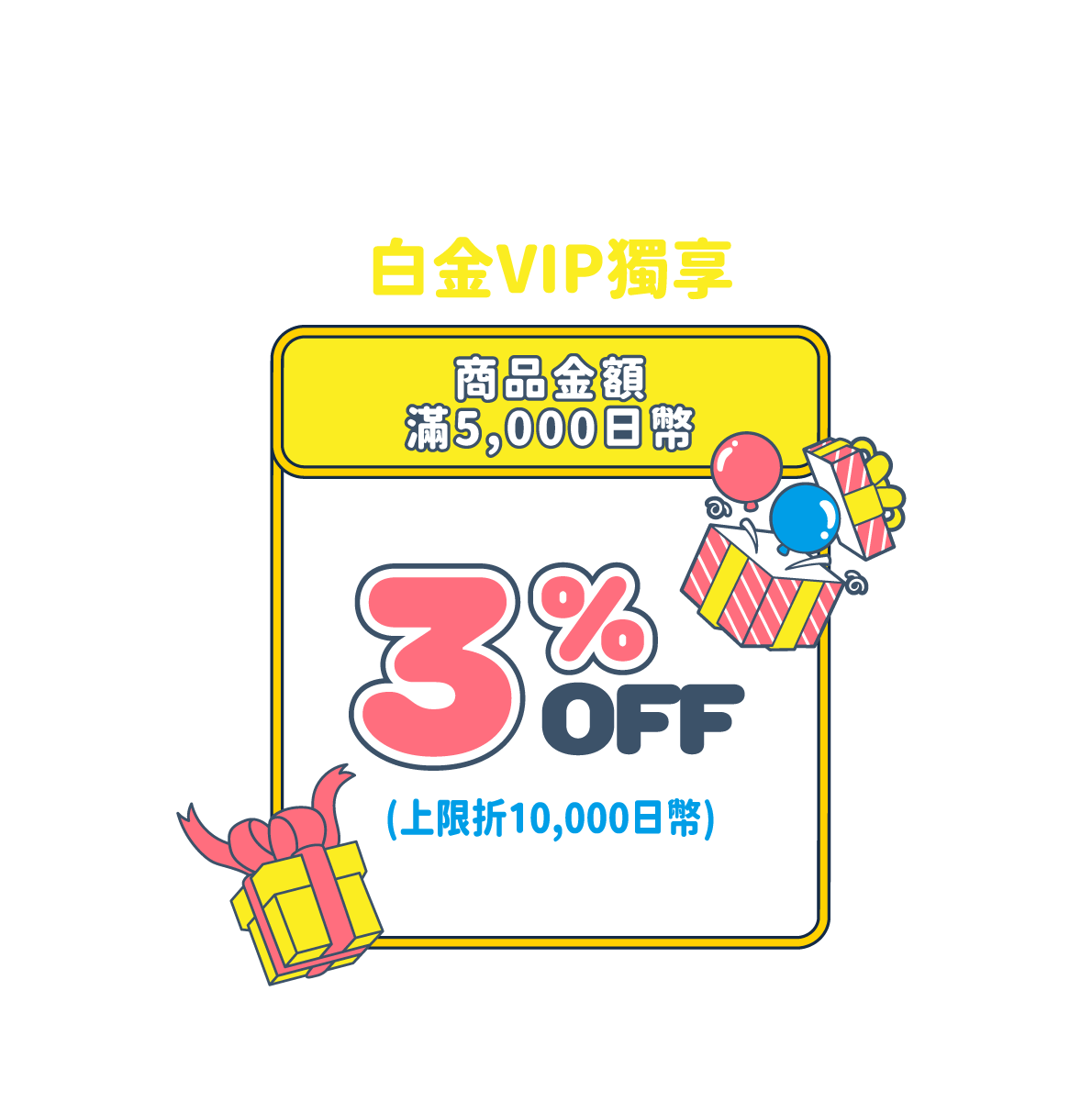 商品金額滿5,000日幣,現折3%OFF,上限折10,000日幣。