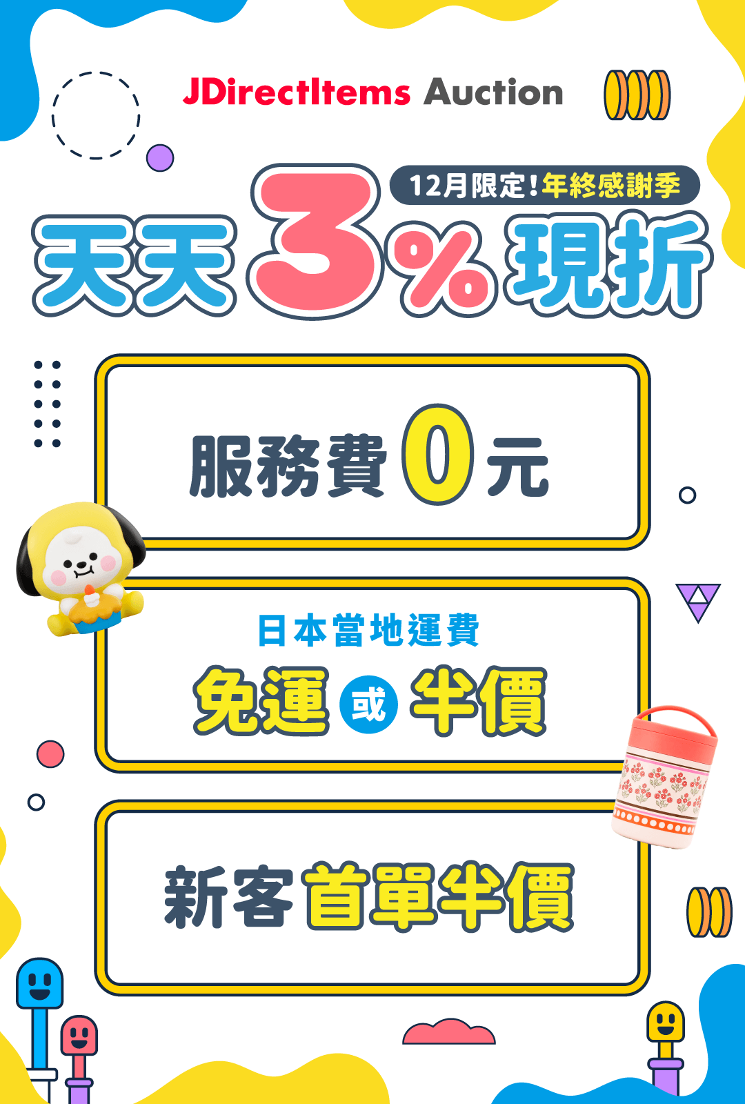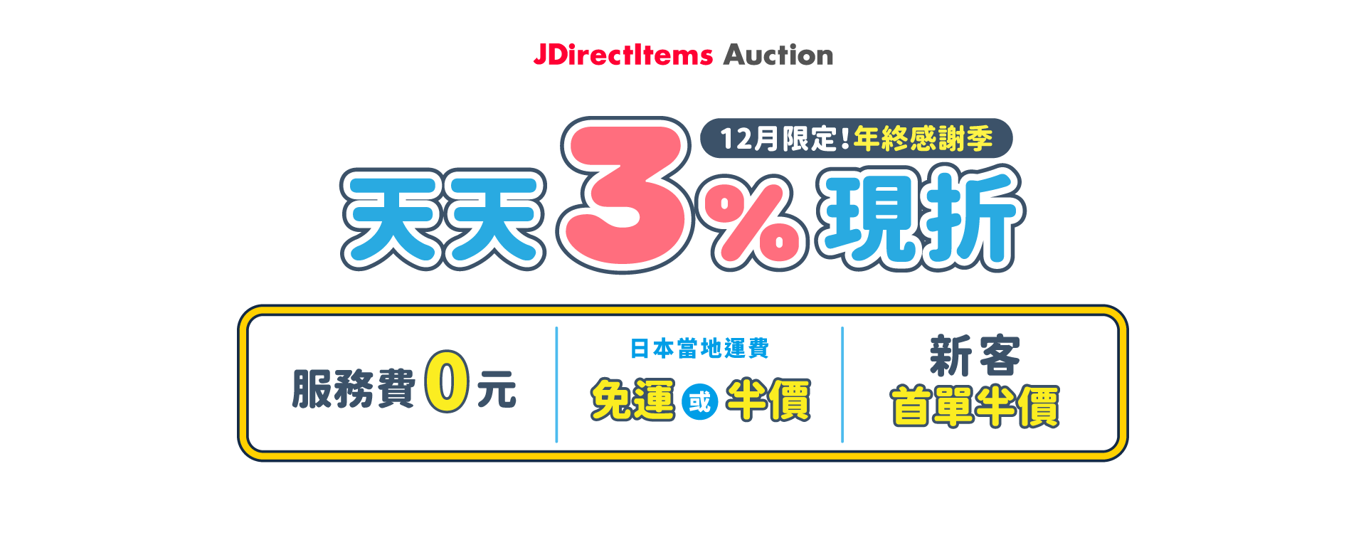 - JDirectItems Auction服務費0元活動不適用於48小時外付款之委託單、類別為「門票、優惠券、預約住宿」項目下,如:禮券、儲值卡…等等之得標商品,及須轉寄至日本其他地址之委託單。