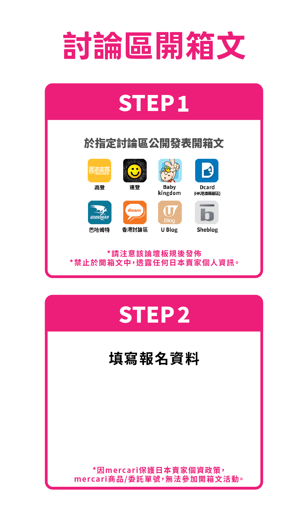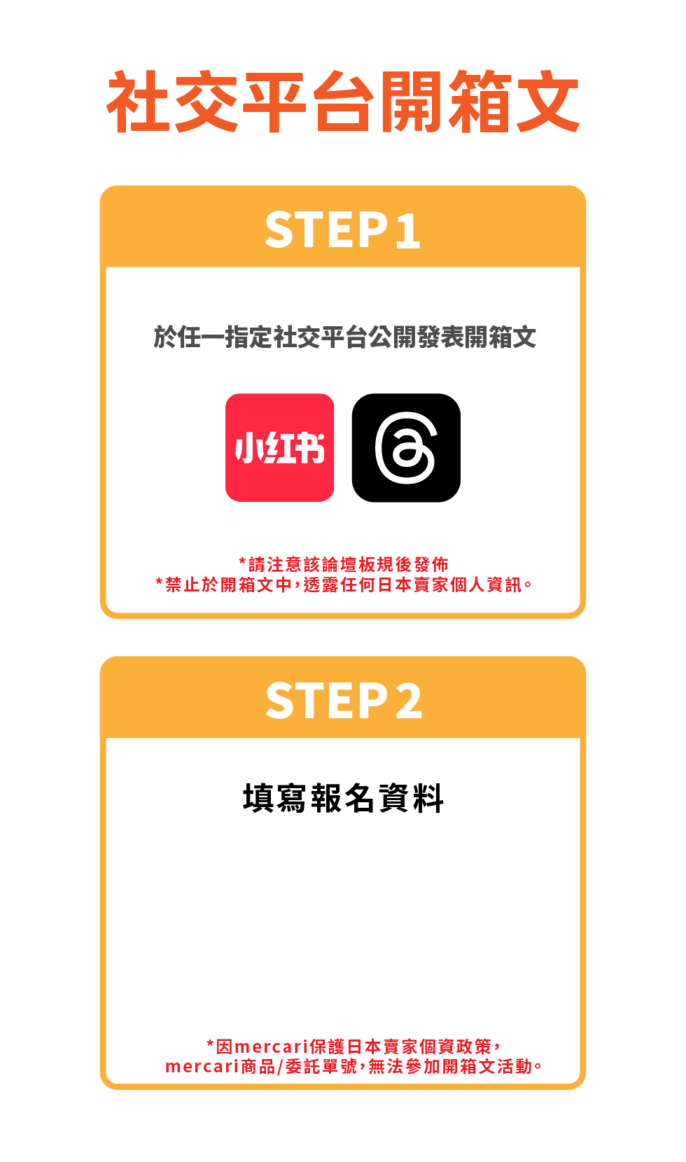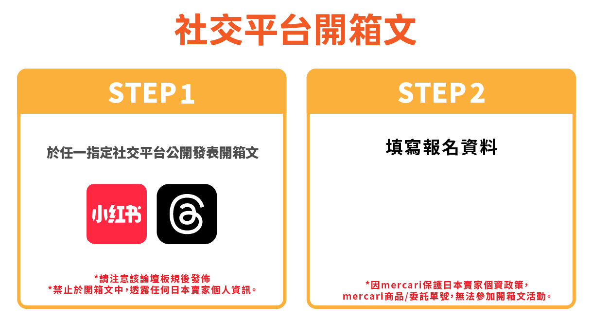 因mercari保護日本賣家個資政策,mercari平台之代購商品/委託單號,無法參加開箱文活動。