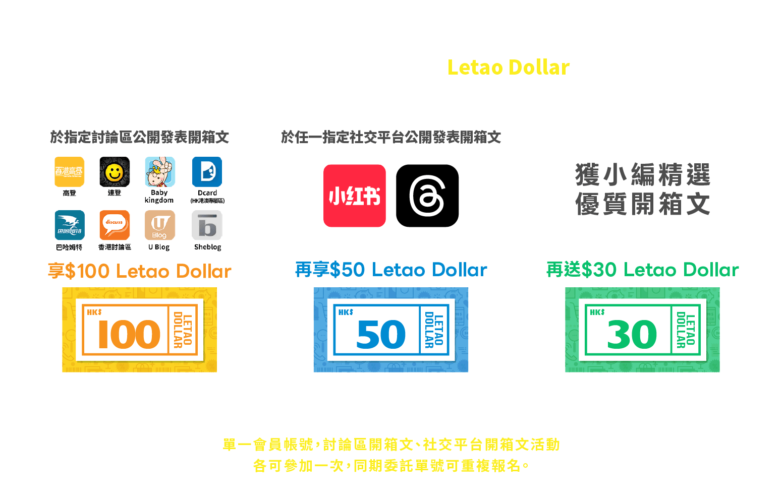 小紅書︰字數需高於150字,並附上3張(含)以上清晰商品實拍圖,或15秒以上開箱影片,可獲獎賞$50 Letao Dollar。