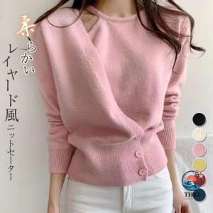 レイヤード風ニットセーター レディース トップス アシンメトリー 無地 セクシー おしゃれ 春 秋 冬 ピンク ブラック ベージュ 韓国風 タートル レイヤード プル