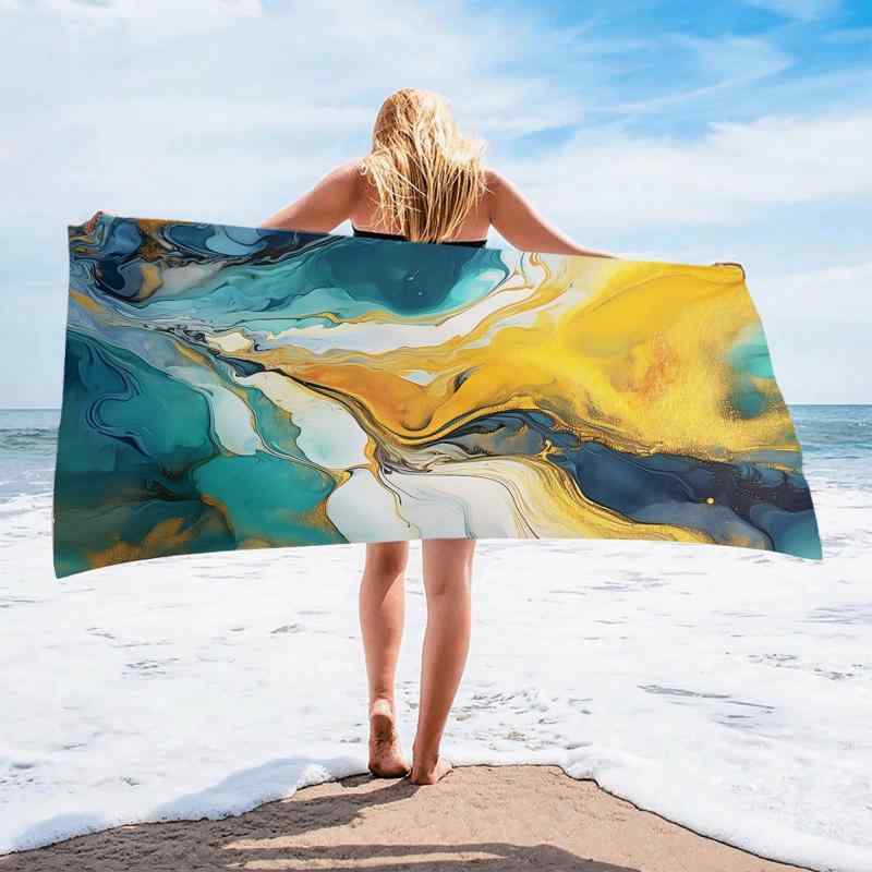 ビーチタオル マイクロファイバー 吸水速乾 軽量 大判 柔らかい デジタルプリント 抽象デザイン 大理石柄
