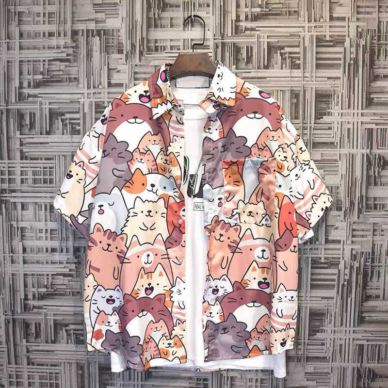 猫 メンズ 薄手 プリント ネコ アロハ ハワイ 五分袖 トップス 猫 ゆったり カジュアル おしゃれ シャツ 大きいサイズ 可愛い 海 着痩せ
