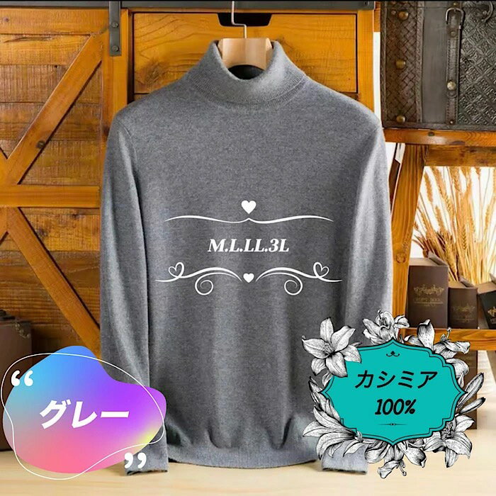 カシミヤ100% ミンク加工 メンズ タートルネック ニットセーター ライトグレー 肌触りのいいふわふわミンク加工 カシミア 選べるサイズ M L LL 3L