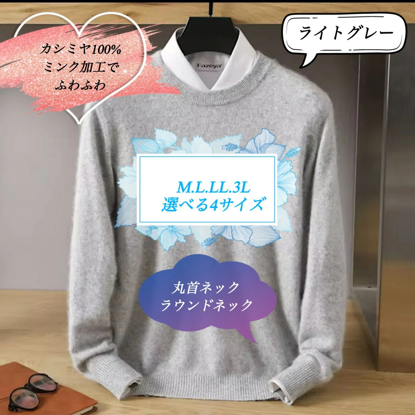 カシミヤ100% 丸首ネックセーター ラウンドネック ライトグレー 選べる4サイズ M L LL XL 肌触りのいいふわふわのミンク加工 カシミア