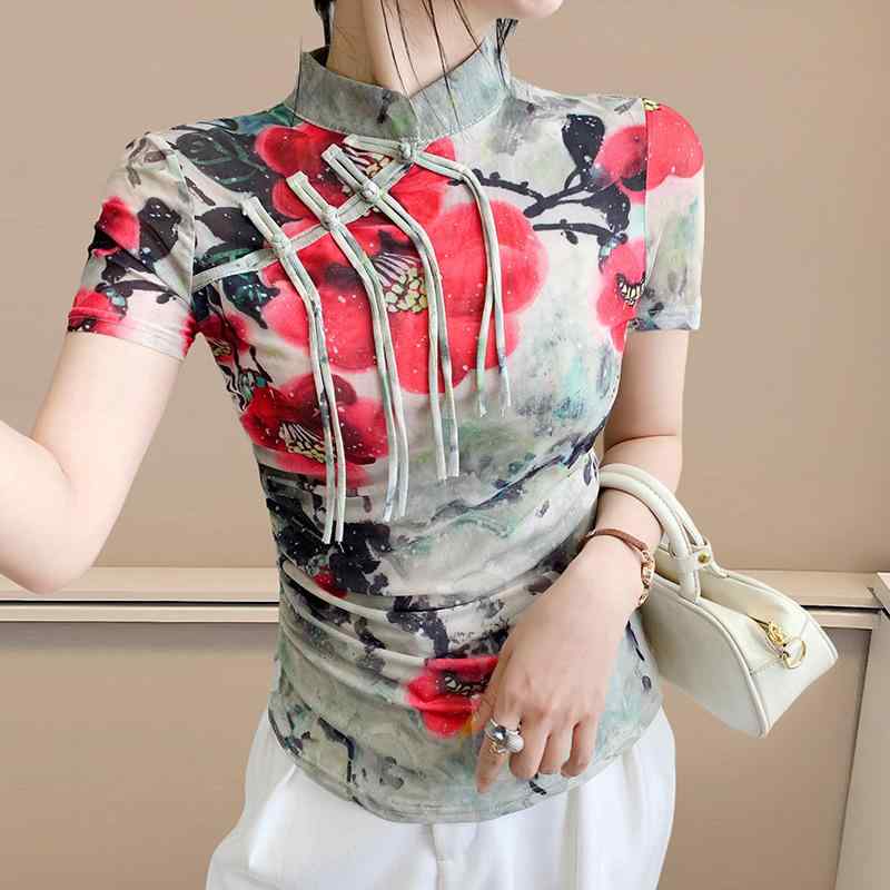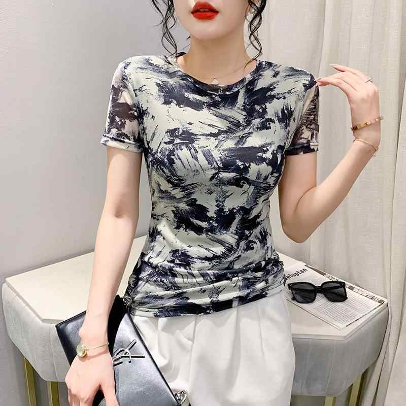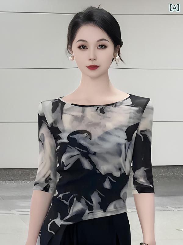 品々が 滲んだ 水墨 画 メッシュ 日焼け防止 Tシャツ 女性用 2025 春夏 ゆったり スリム 西洋風