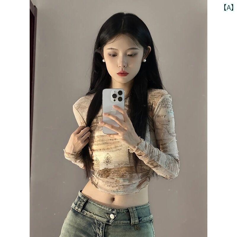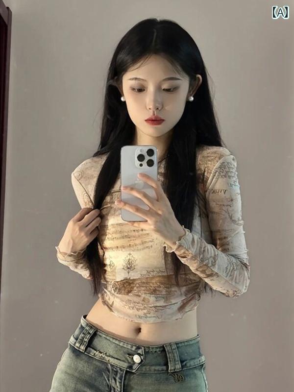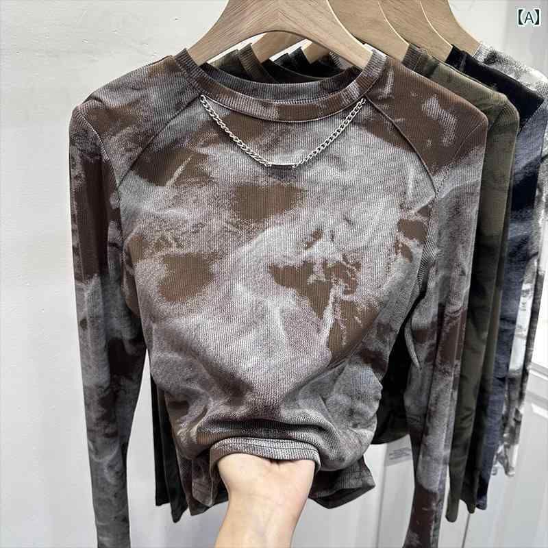 レディース トップス アメリカン レトロ タイ ダイ 水墨 画 長袖 Tシャツ 女性用 秋 な スタイル ホット ガール スリム ショート レイヤリング シャツ トップ