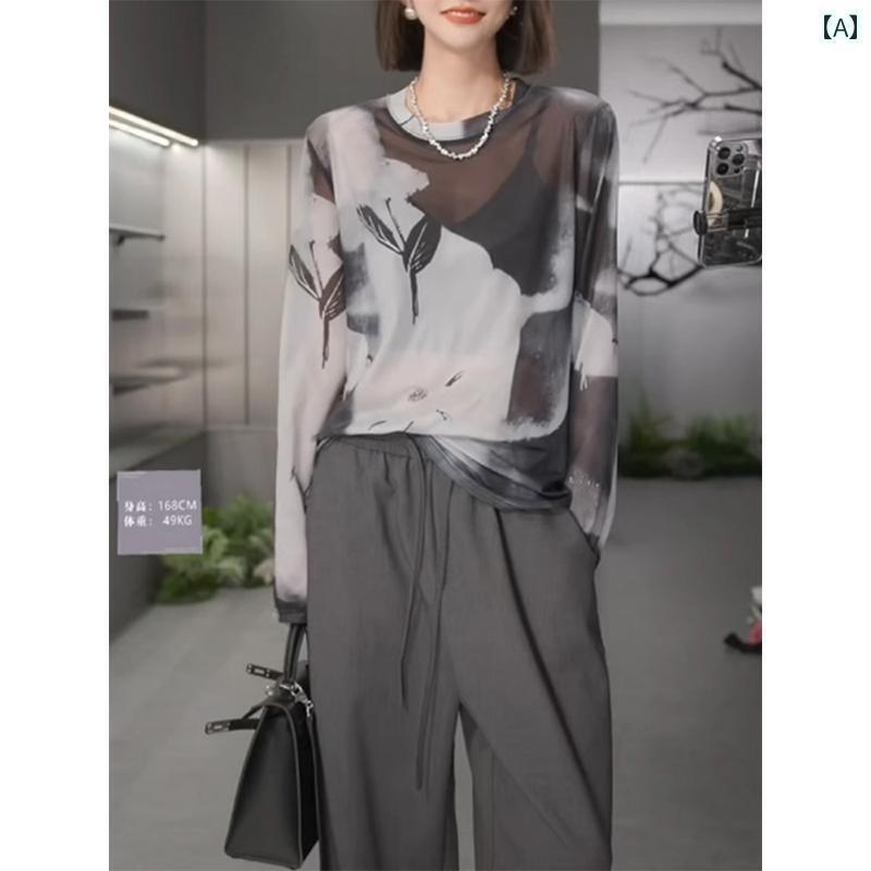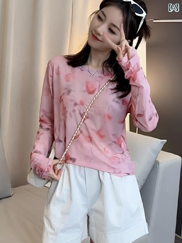 レディース トップス 不規則な 水墨 画 ラウンドネック 薄手 長袖 Tシャツ 女性 2025 夏 スリム 日焼け防止 トップ