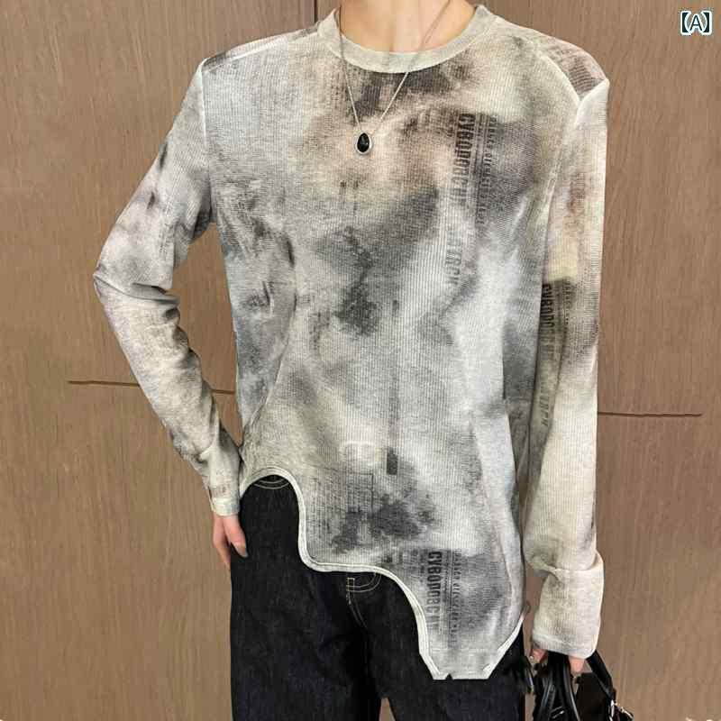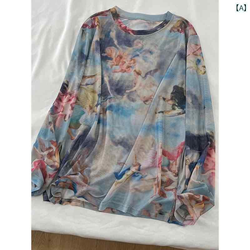 品々 タイ ダイ 染め 水墨 画 プリント 長袖 薄手 メッシュ Tシャツ レディース ゆったり おしゃれ 万能 レイヤリング シャツ