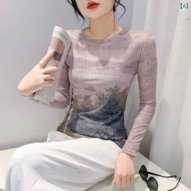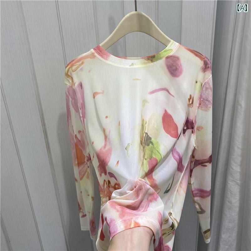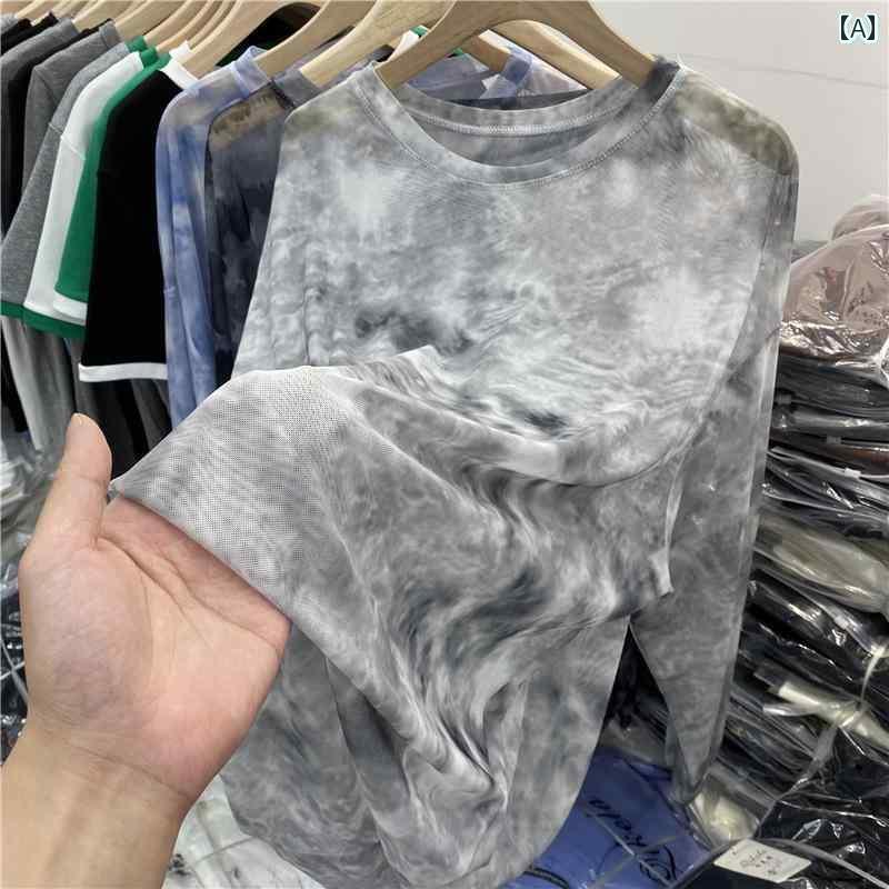 女性用 絞り 染め メッシュ レイヤリング シャツ 水墨 画 インナーウェア スモール 長袖 Tシャツ 冷感 日焼け防止 スキン 服
