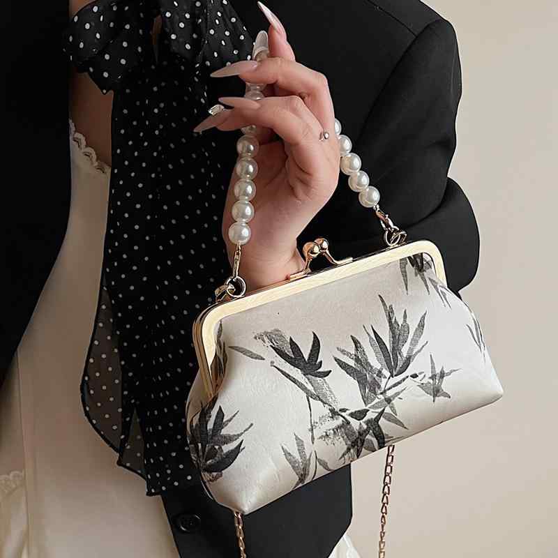 風 竹柄 パール装飾 シェル型 3WAY ショルダーバッグ クロスボディバッグ がま口 シルク素材 春夏 普段使い