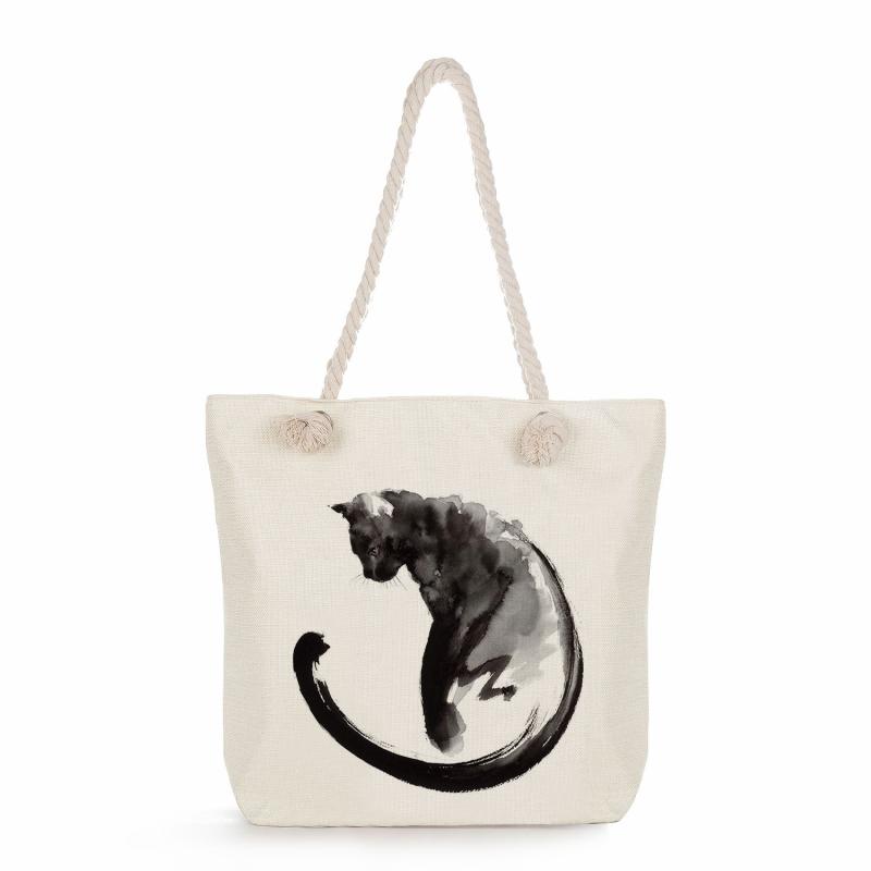 風 猫柄 大容量 肩掛け 手提げ 普段使い 旅行用 麻 リネン素材 横長 スクエア ファスナー開閉 内ポケット付き 個性的なデザイン