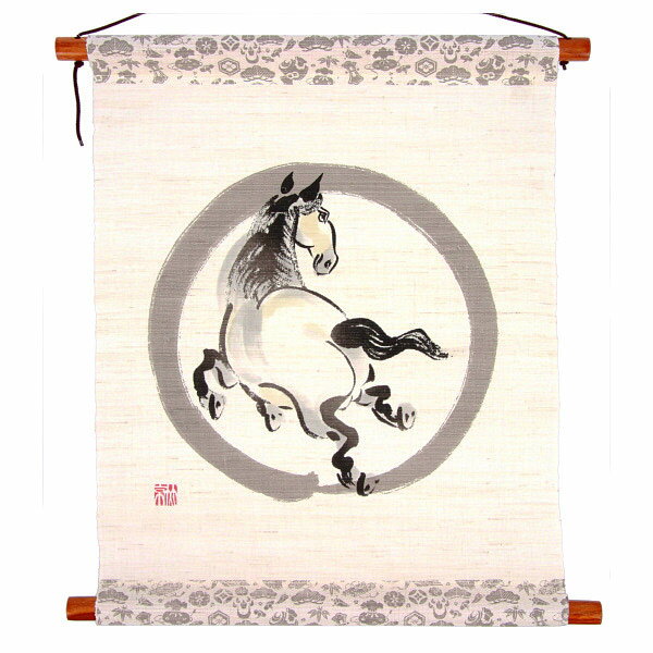 ある円相馬 うま柄 午歳壁掛けタペストリー 麻100% 干支掛け軸 日本製 お歳暮 お年賀 贈り物 午年