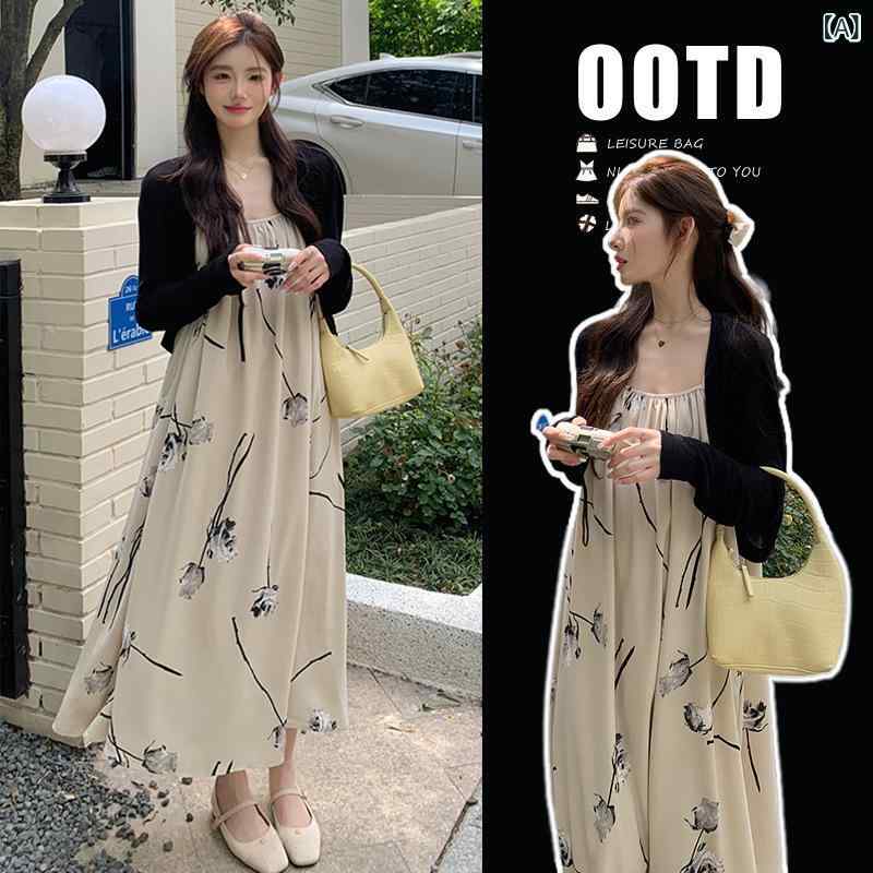 柄 ゆったり キャミ ロングドレス 長袖 UVカット 日韓 カジュアル 杏 黒