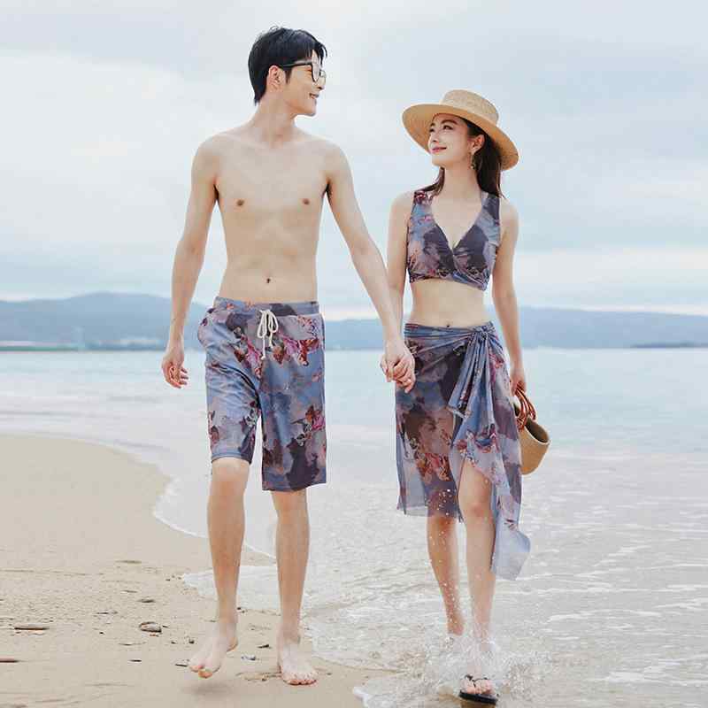 水着 カップル ペア レディース メンズ ワイヤー入り パッド付き 体型カバー ビキニ3点セット サーフパンツ 温泉 リゾート プール 夏