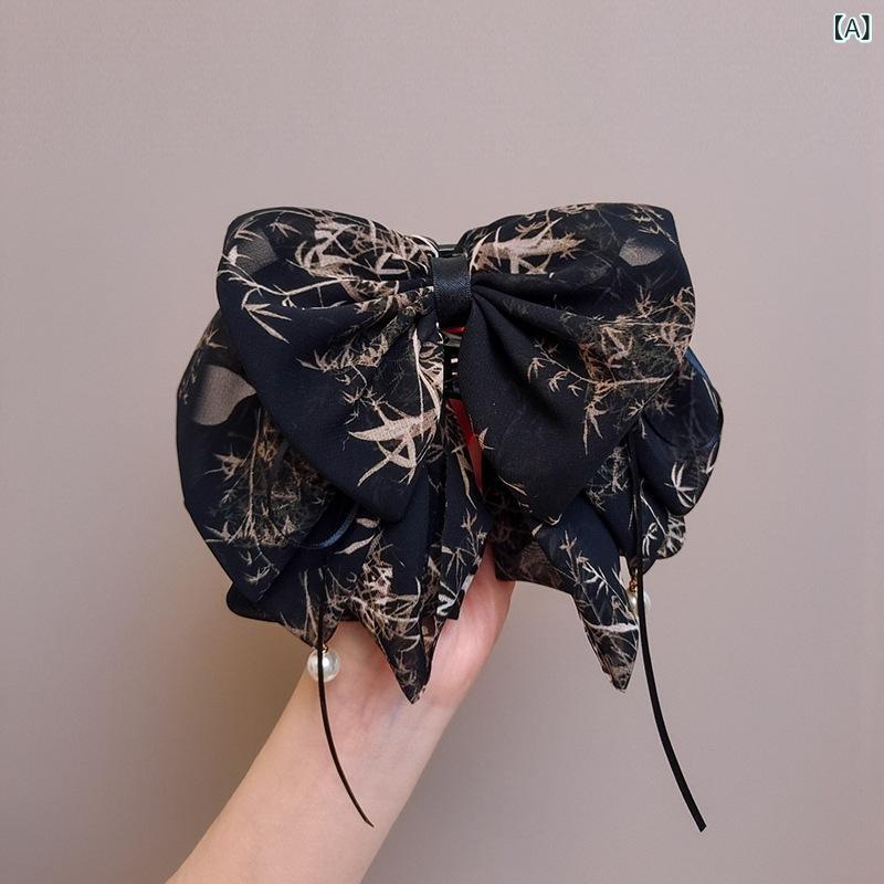 風 白黒 プリント 立体 ビッグリボン 垂れ飾り レトロ エレガント 上品 ハーフアップ ポニーテール 髪留め 普段使い お洒落