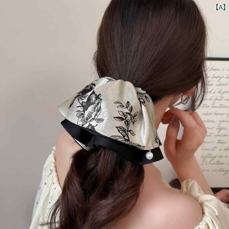 プリント フレア リボン サテン調 高級感 布製 バンスクリップ ポニーテール ハーフアップ まとめ髪 髪留め 上品 髪飾り