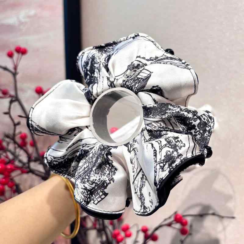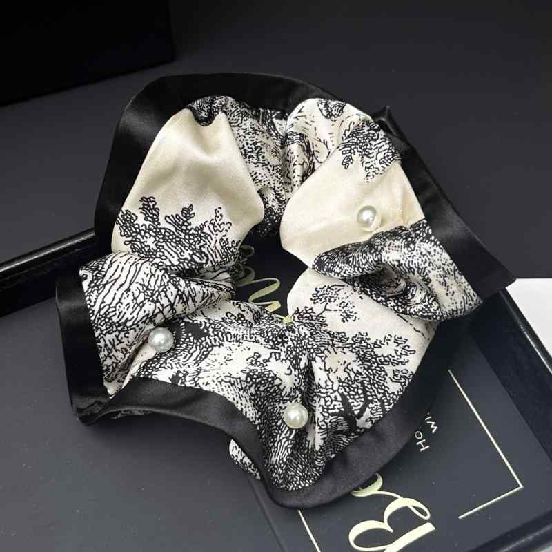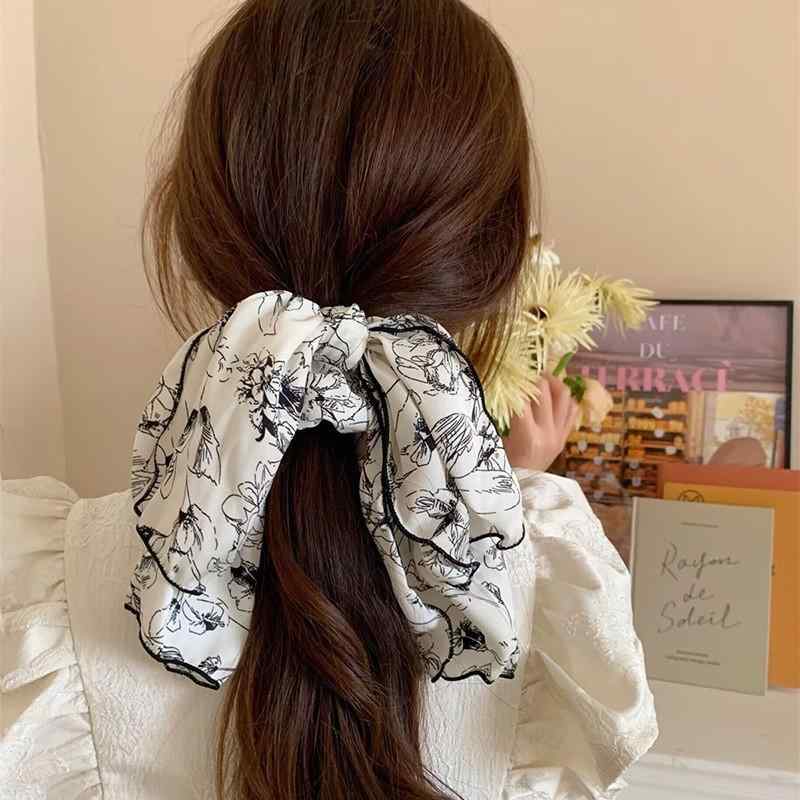 風 花柄 サテン 艶やか ボリューム ヘアゴム ポニーテール 髪飾り 上品 大人可愛い 白 黒 おしゃれ