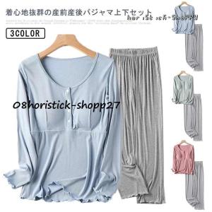 マタニティ ルームウエア パジャマ 前開き 綿100% 長袖 上下 セット 長ズボン 授乳口付き マタニティウェア 授乳服 部屋着 セットアップ ロン