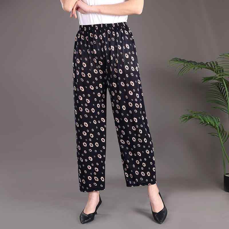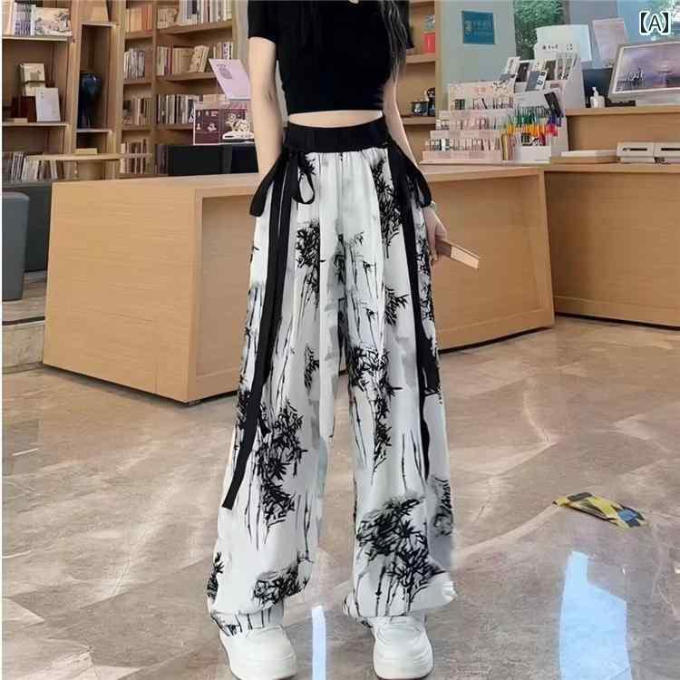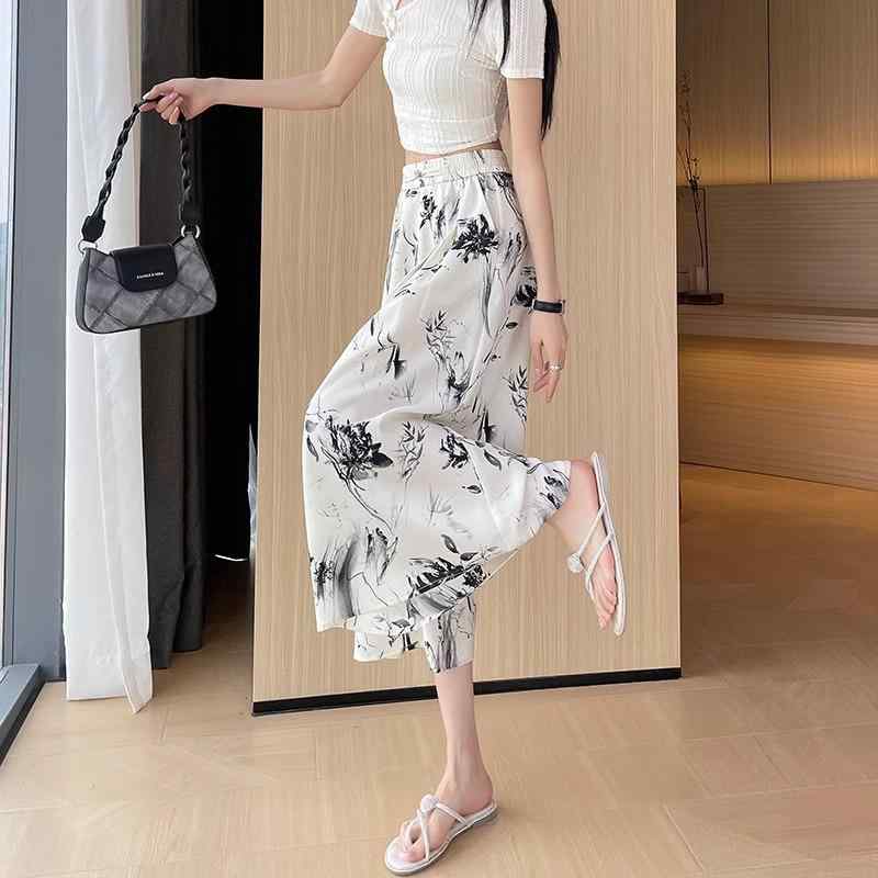 風プリント ワイドレッグパンツ アンクル丈パンツ ポリエステル 高見え 接触冷感 伸縮性