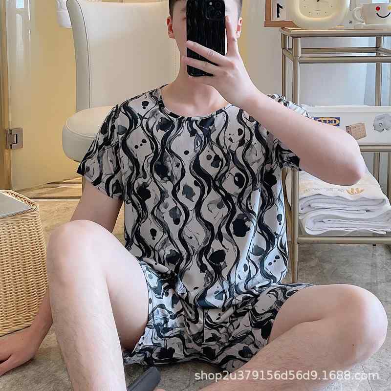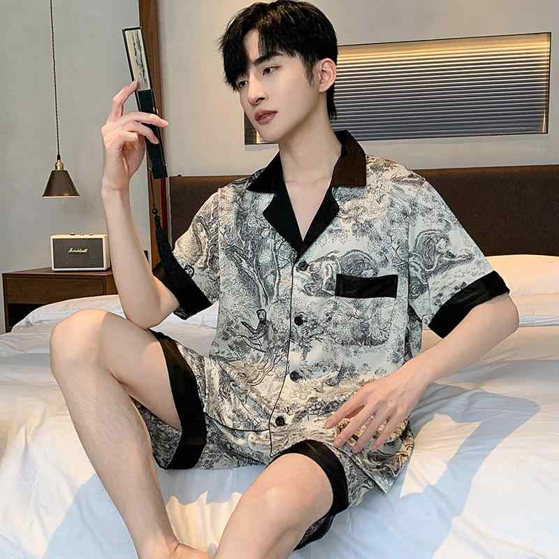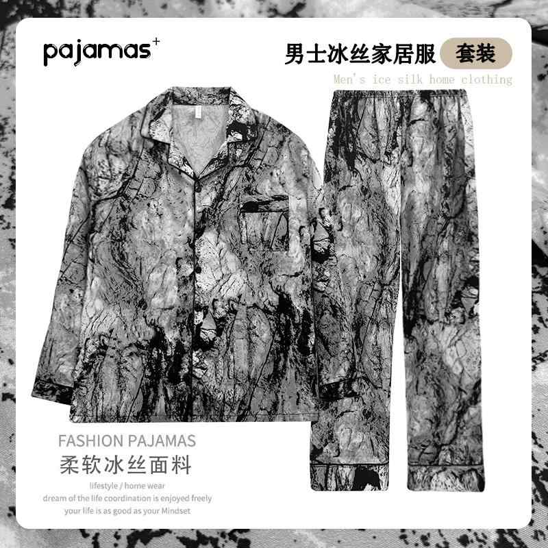おしゃれ 肌に優しい 快適 メンズ パジャマ 上下 ラン シャ シルクパジャマ メンズ 夏 冷感 2025 水墨 画風 高級 春秋 ホーム 服