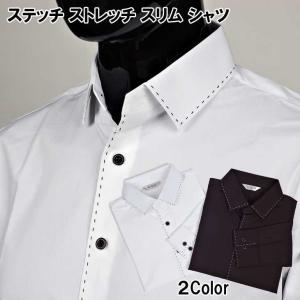 ドレスシャツ 伸びるストレッチ生地 ステッチ 装飾 長袖 ワイシャツ スリムライン シャツ 黒と白 2色