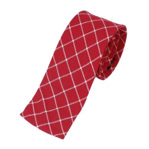 ネクタイ レッド ラインチェック柄・スクエアネクタイ・ナロータイ 大剣幅5.5cm 綿・コットンタッチ、マット