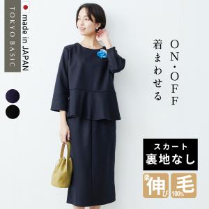 スカート裏地なし 入学式 服装 ママ セレモニースーツ 日本製 卒業式 40代 50代 圧縮 ウール100% ペプラムプルオーバー ロングスカート 体型カバー