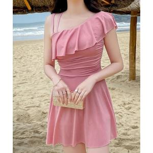 水着 レディース ワンピース オールインワン 体型カバー おしゃれ かわいい 20代 40代 肩出し アシメ 黒 無地 フリルヘム オトナ女子 フレアスカート お洒落