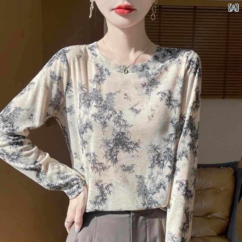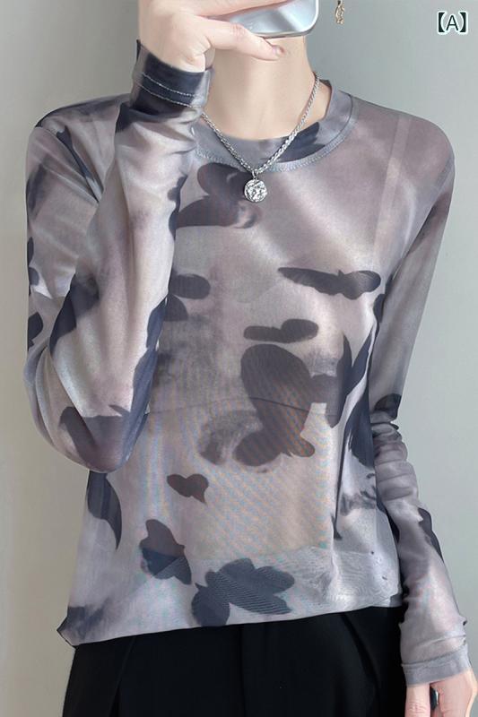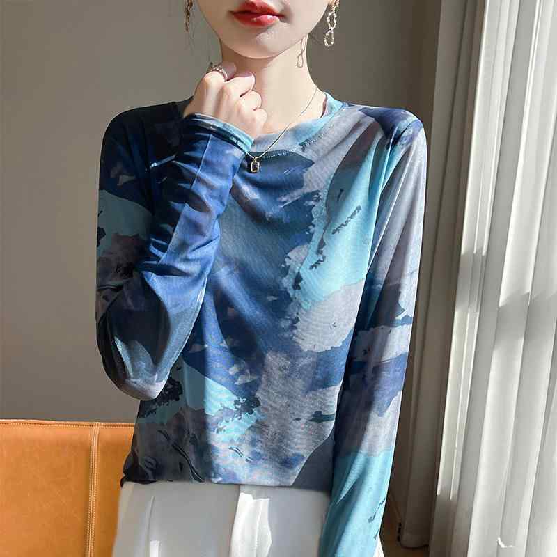 トップス レディース 再生繊維 ポリエステル メッシュ ラウンドネック 長袖 Aライン なめらか