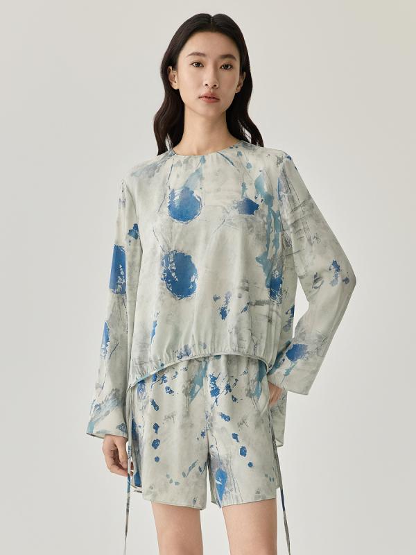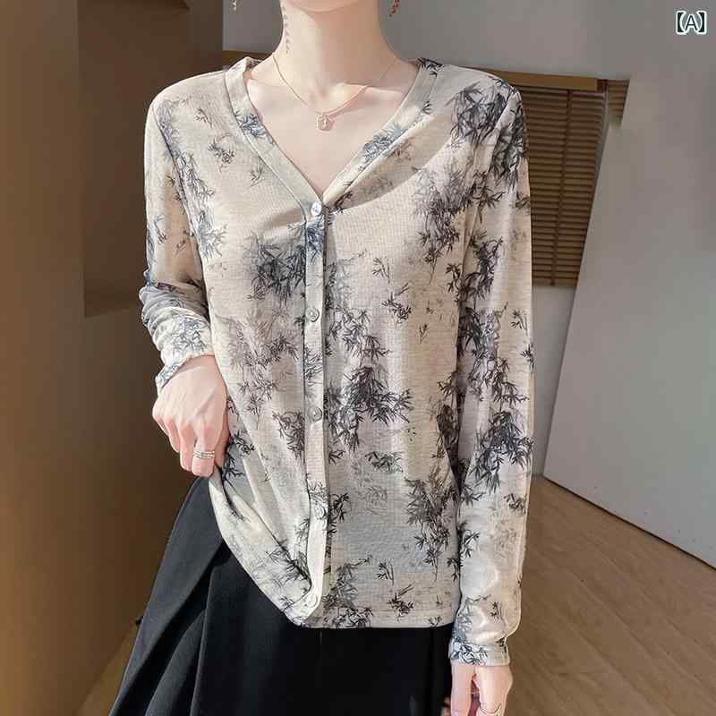 風プリント 韓国 着回し 長袖 シフォン ポリエステル ゆったり ポロ襟 前開き エレガント 通勤