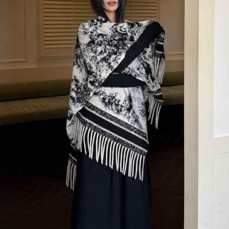 ロング丈 フリンジ 保温 あったか 旅行 ショール 羽織り アウター ポリエステル ブラック ブルー