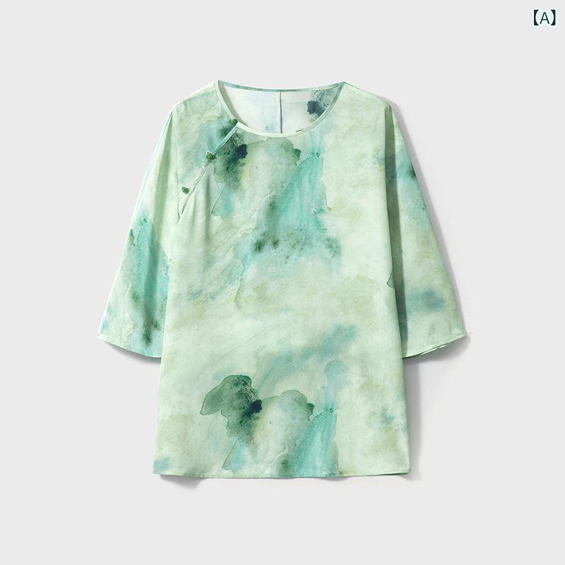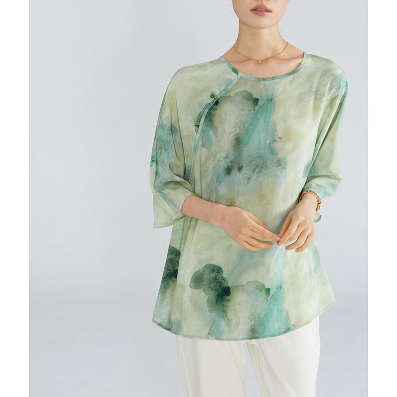 風グラデーションプリント チャイナ風 エレガント 上品 きれいめ 七分袖 クルーネック 着痩せ 通勤 お出かけ グリーン