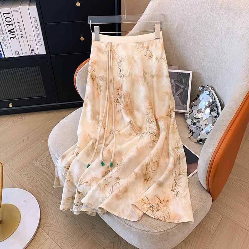 風 花柄 ハイウエスト Aライン ミディ丈 着痩せ 体型カバー 小柄向け ポリエステル 伸縮性 グリーン系 イエロー系 春夏 通勤 普段使い