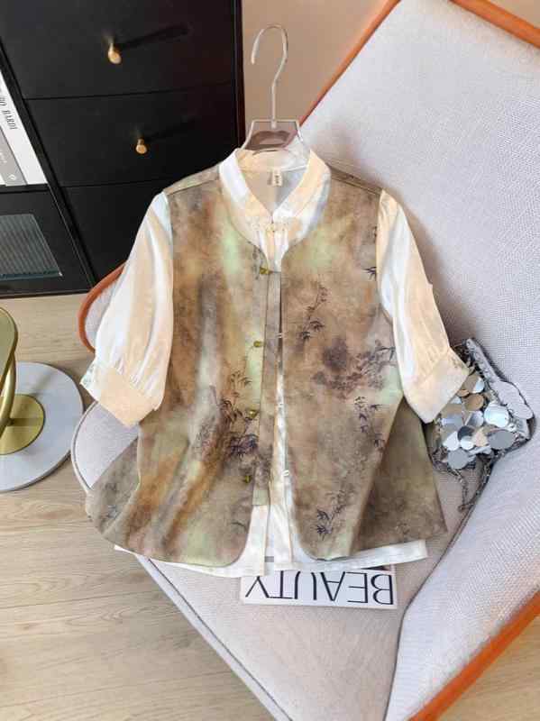 風 風景柄 プリント 開襟 ショート丈 羽織り ジレ Uネック ボタン ポリエステル 上質 カジュアル アート 春夏 トップス