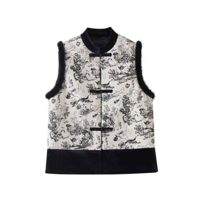 ジャカード ベスト レディース 中華風 クール ハイウエスト スリム Vネック