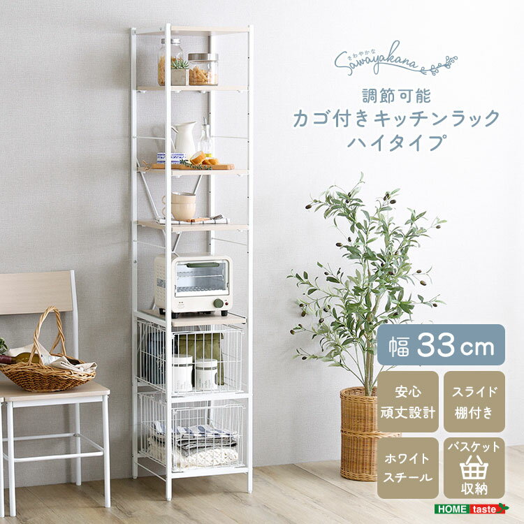 キッチンラック ロータイプ スライド棚 幅33cm カゴ付き バスケット コンパクト レンジラック 電子レンジ台 キッチン収納 台所収納 ストッカー 一人暮らし ナチュラル ホワイトフレーム 金属フレーム スチール 北欧 カントリー