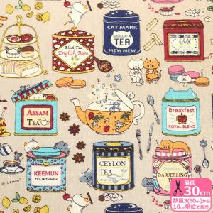 紅茶猫 綿麻キャンバス 猫 猫柄 ネコ 紅茶 紅茶柄 ティーポット プリント生地 綿麻キャンバス生地 コットンこばやし 生地 布 数量3(30cm)から10cm単位 2958