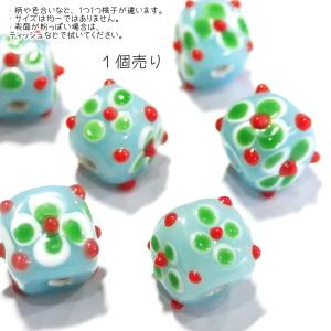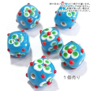 30433-瑠璃玉 とんぼ玉 青x白 花 四角 標準10mm程度 【1個】