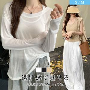 爆売 2枚セット ロンT レイヤード シアー トップス tシャツ 長袖 重ね着 Uネック クルーネック 体型カバー シースルー UV 紫外線 秋冬 ス