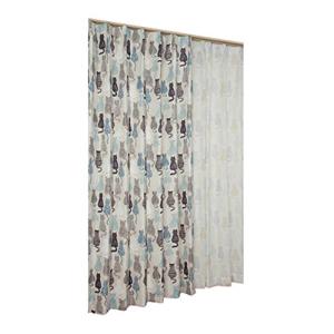 ユニベール ねこ柄ドレープ&ねこ柄レースカーテンセット にゃかよし ブルー 幅100×丈200cm 4枚組