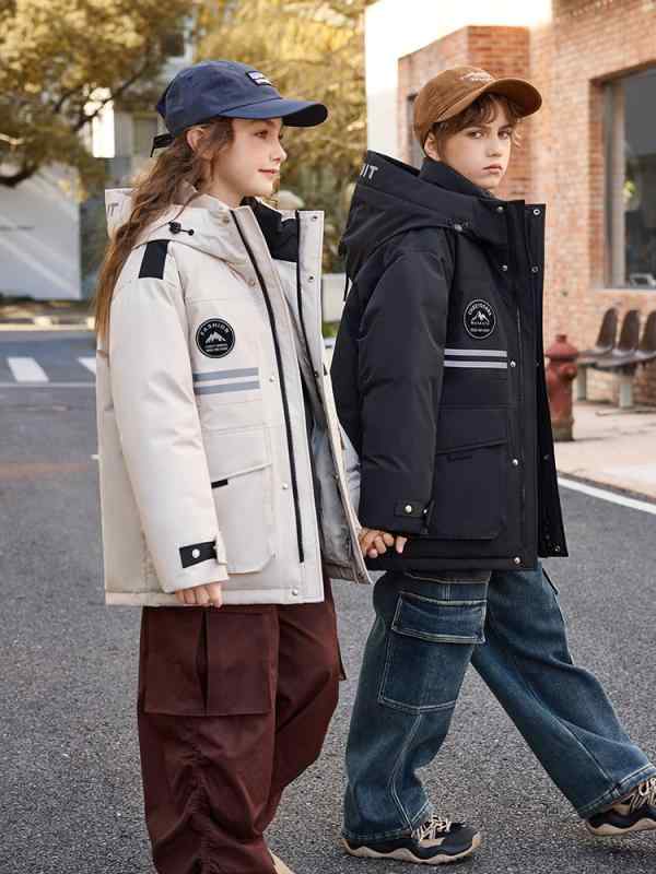 子 ジュニア 男女兼用 秋冬 アウター ミドル丈 防寒 厚手 ダウン 保温 ゆったり フード付き カジュアル 普段使い 通学 黒 白 ピンク 紫 迷彩柄