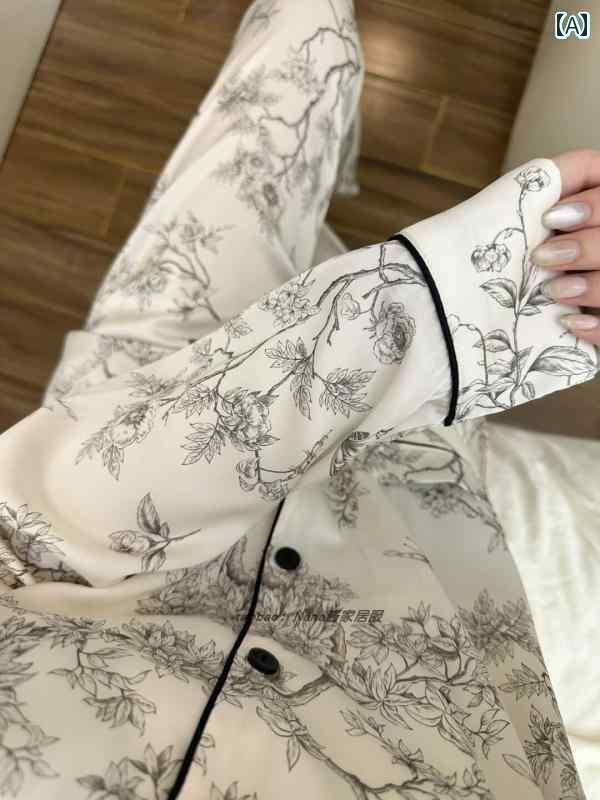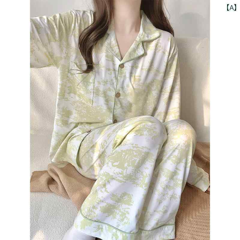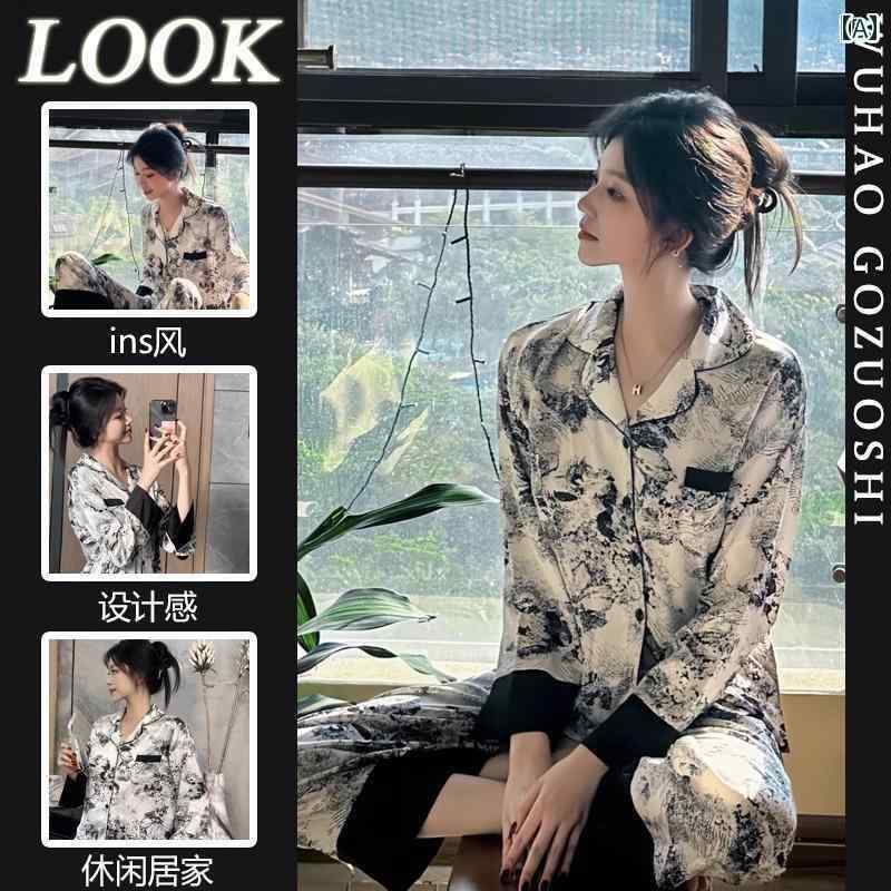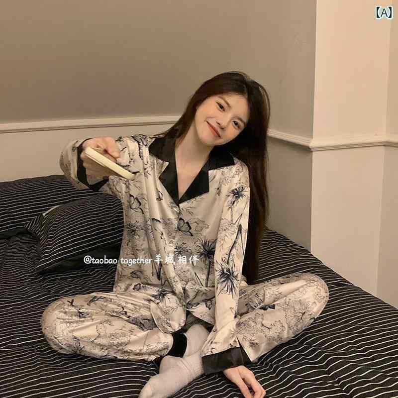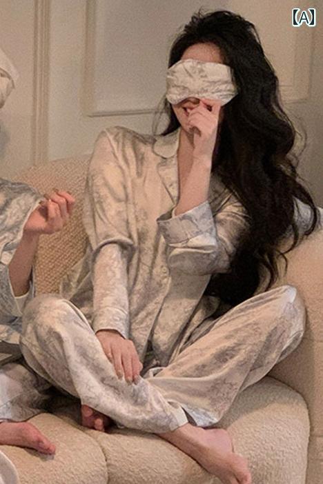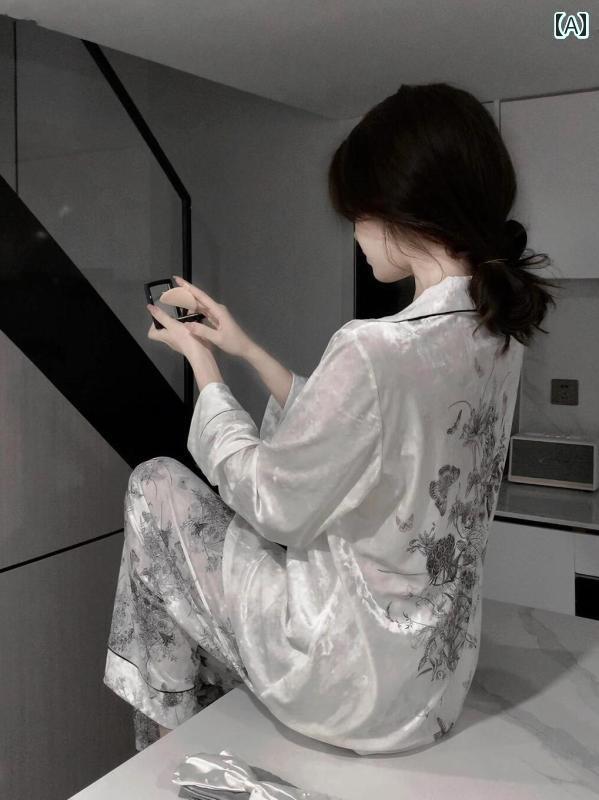 シルク パジャマ レディース 韓国 パジャマ 女性用 春秋 スタイル 冷感 長袖 イン 高級 水墨 画 薄手