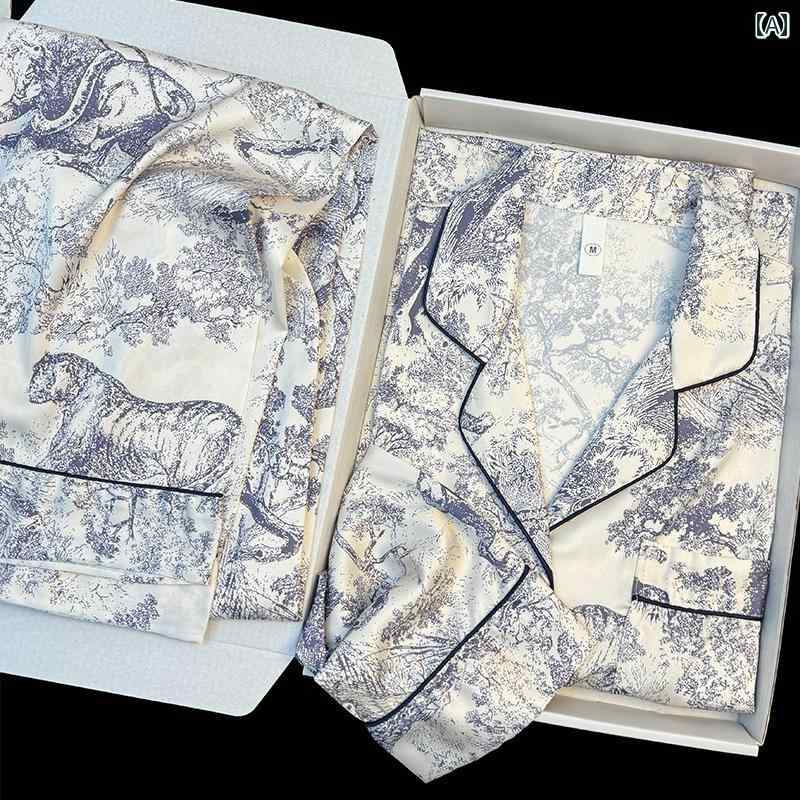 シルク パジャマ レディース 高級 獣 水墨 画 氷 紬 シルク スムース パジャマ レディース 夏 2025 長袖 ズボン ツーピース セット