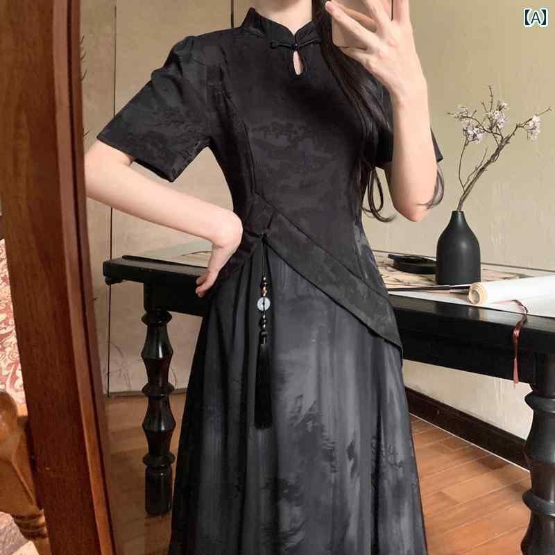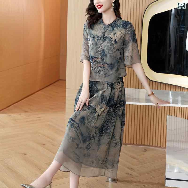 レディース ツーピース シルク 翔 雲 社 夏 チャイナ風 シルク ツーピース スーツ ファッション 桑 絹 ゆったり 水墨 画 トップス スカート